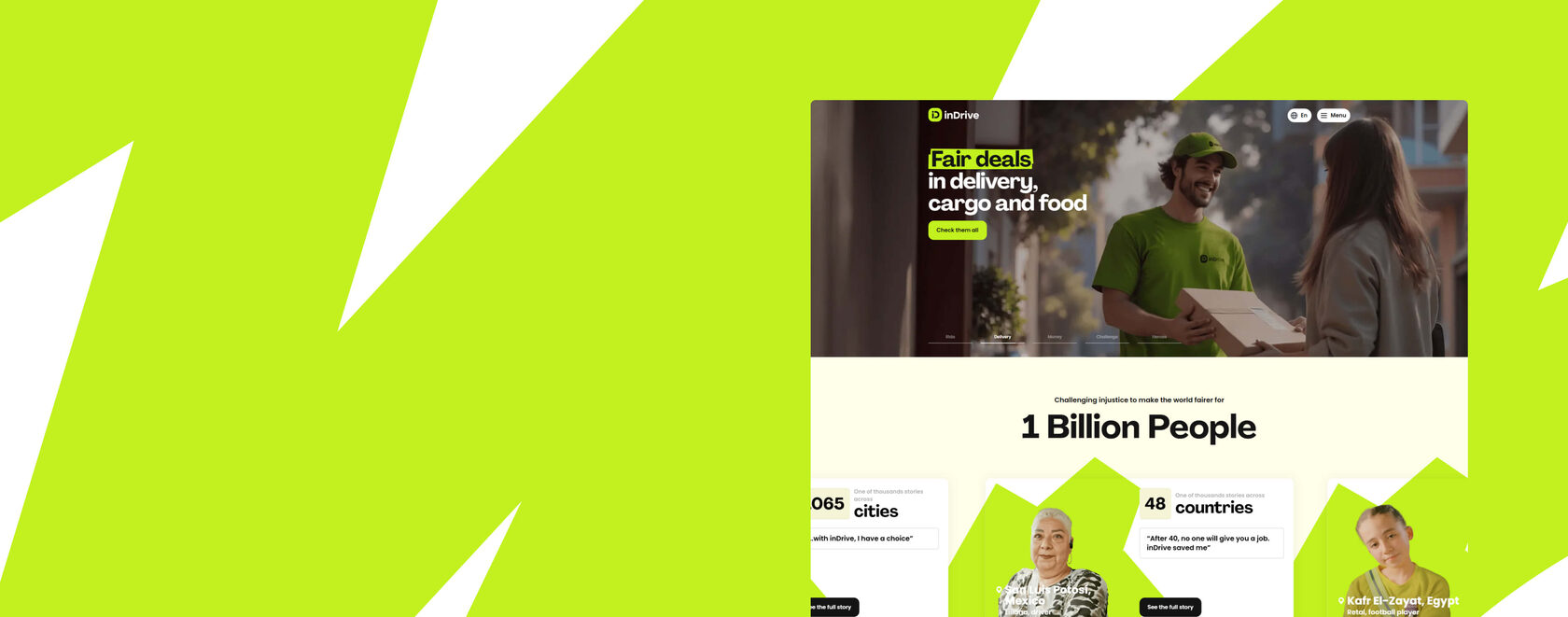 For inDrive’s internal creative lab, inlab, we design and build landing pages and promotional projects. In parallel, we collaborate with the inDrive brand team — designing dedicated content blocks on indrive.com, and contributing to the inDrive blog.
