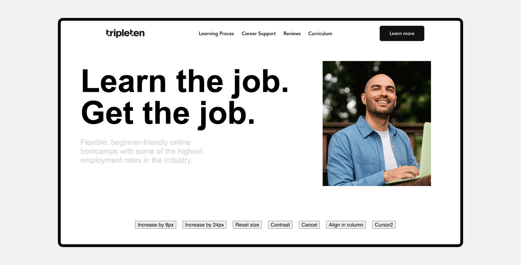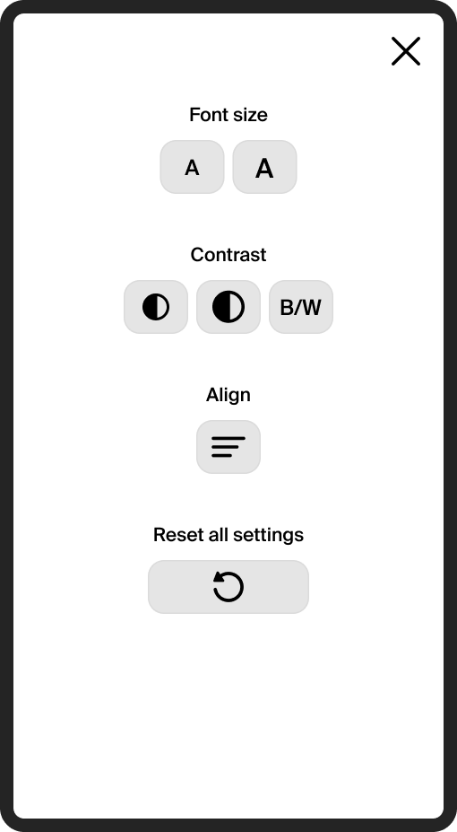When developing for no-code, it is important to create a sustainable solution that does not interfere with platform updates. Sometimes compromises are necessary. One such compromise was finding a technical solution for zooming in and out of text. We found that it was impossible to zoom in on text elements without breaking certain parts of the site. So we decided to zoom in on all content elements. This functionality will require some adjustments in the future.